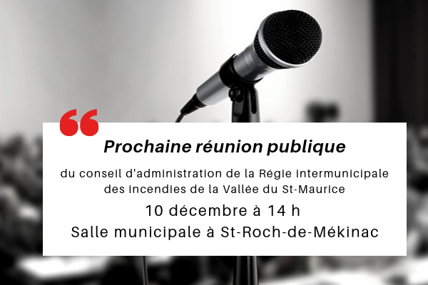 Prochaine réunion publique du conseil d’administration de la Régie aura lieu le 10 décembre prochain à 14 h à la salle municipale de St-Roch-de-Mékinac.