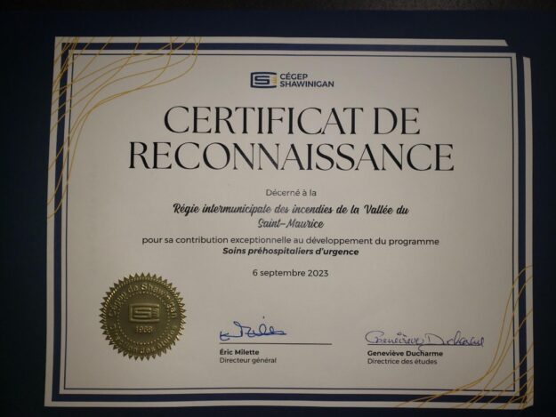 Le 20 juin dernier, 5 membres de la Régie intermunicipale des incendies de la Vallée du Saint-Maurice ont reçu un diplôme.